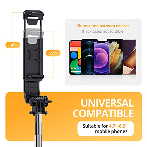 - [Wide Compatibility] The Bluetooth selfie stick tripod remote control is compatible with iOS 5.1and Android 4.4 devices. The included phone holder expands 2-4" wide to securely fit any modern cell phone with or without a phone case. Selfie Stick Phone Tripod mount is compatible with iPhone 12 Pro Max, 12 Mini, 12 Pro, 12, 11 Pro Max, 11 Pro, 11, XS Max, Samsung Galaxy S20/S10+/S9/S9+/S8/S8+, Note 10/9/8/7, LG, Google Pixel, Sony, etc.