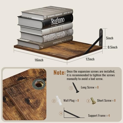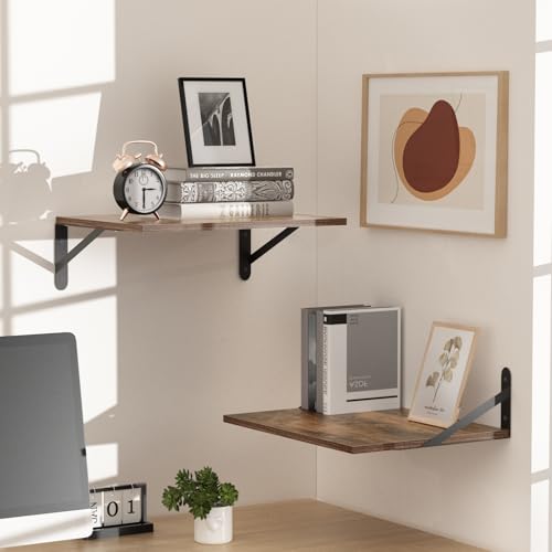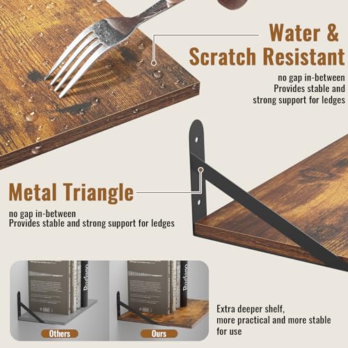 - Heavy Duty Floating Shelves: deep shelves are made of hardwood with a surface that is easy to clean and maintain. The heavy-duty triangular metal brackets provide strong and stable support for the board effortlessly