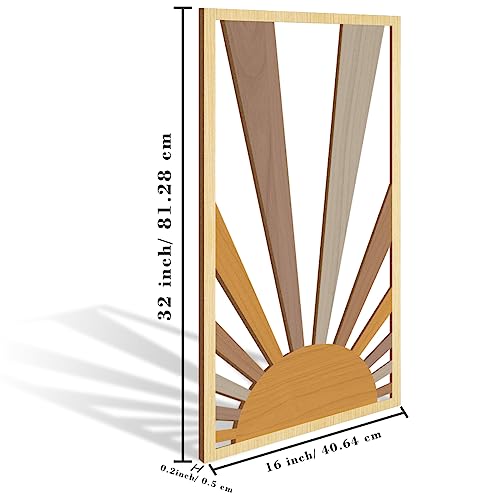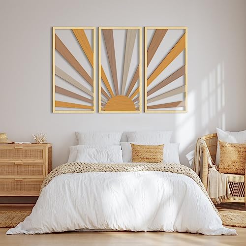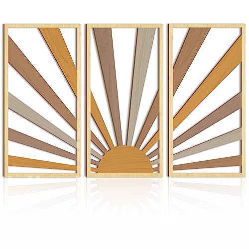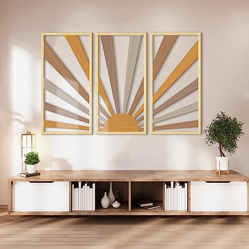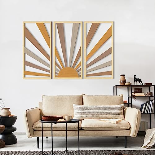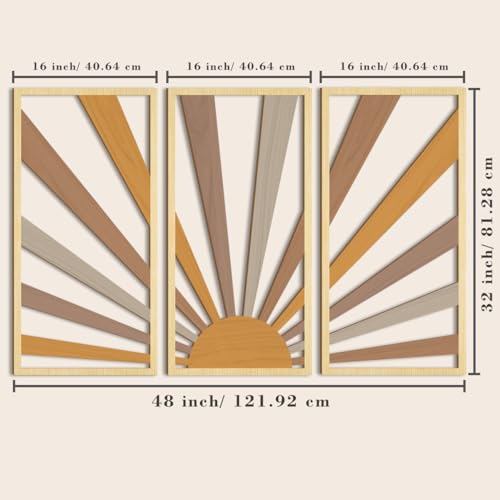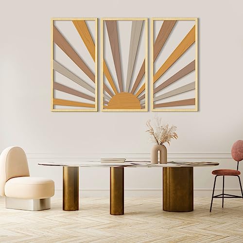 AUIAU - لوحة فنية كبيرة بتصميم بوهو من خشب الشمس بتصميم هندسي مجوف من اوياو لديكور الحائط بتصميم منتصف القرن، 3 لوحات منحوتات حائط بنمط شروق الشمس، مجموعة خشبية لغرفة المعيشة والنوم والمطبخ والمكتب 41×81 سم