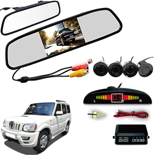 Auto Pearl - Auto Pearl 4.3 Inch TFT LCD Rearview Mirror Parking Video System with 16.5 MM for Reverse HD Camera, 4 Black Parking Sensors Compatible with Scorpio (2009-2014)