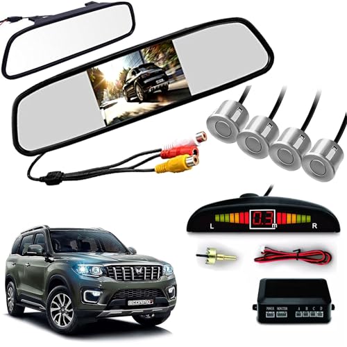 Auto Pearl - Auto Pearl 4.3 Inch TFT LCD Rearview Mirror Parking Video System with 16.5 MM for Reverse HD Camera, 4 Silver Parking Sensors Compatible with Scorpio N-2022