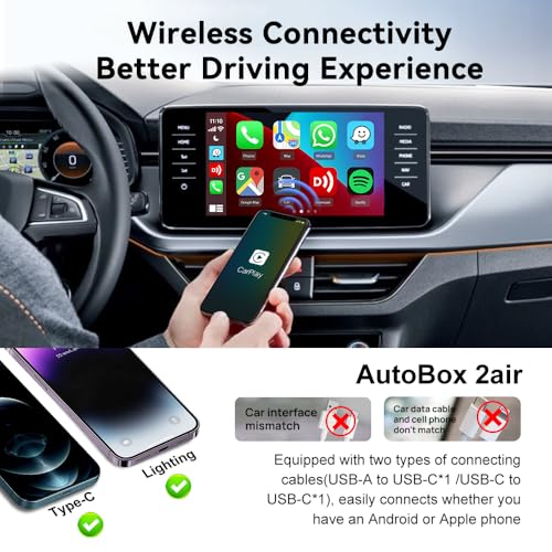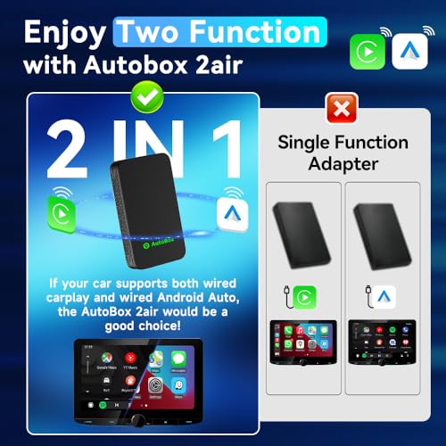 - 【CarPlay Android Auto Wireless Adapter】No need for wired connections anymore, now immediately it is so easy to convert your wired CarPlay or Android Auto to wireless with Autobox 2-in-1 Wireless Adapter! You can continue to use the full CarPlay and Android Auto function and keep the original car operation, such as navigation, music playing, Siri assistant, phone calls, etc.