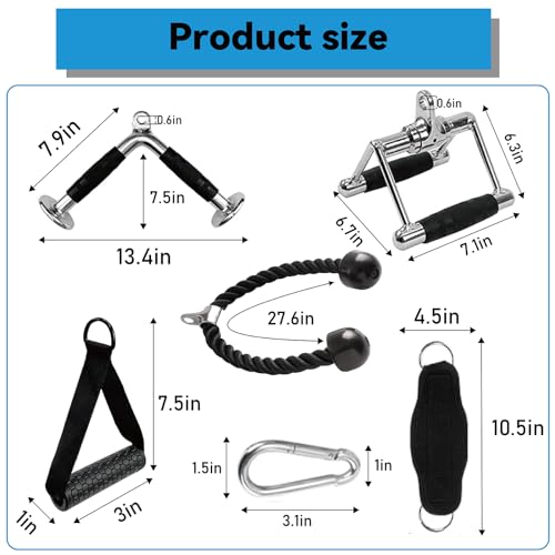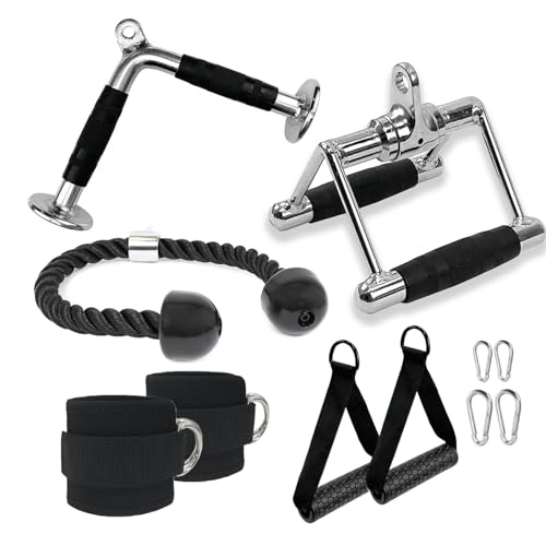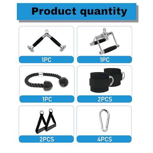 - ✔ ملحق ممتاز لآلة الكيبلات: تتضمن مجموعة ملحقات آلة الكيبلات هذه حبل سحب ثلاثي الرؤوس ومقبضين سحب للتمرين وشريطين للكاحل ونوعين من مقابض السحب على شكل حرف V و3 حلقات تثبيت لممارسة ثلاثية الرؤوس القوية وقوة الإمساك، للمساعدة في التمارين المركبة لمناطق العضلات المختلفة مثل اليدين والظهر والبطن!