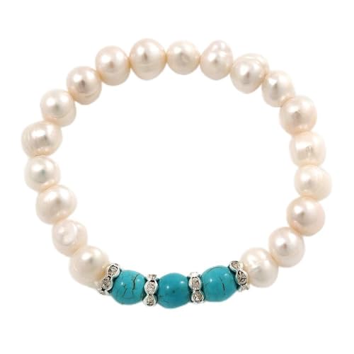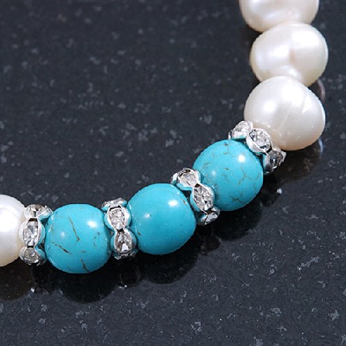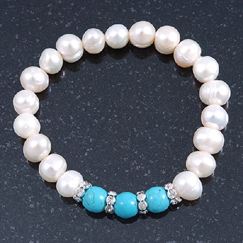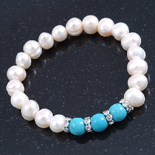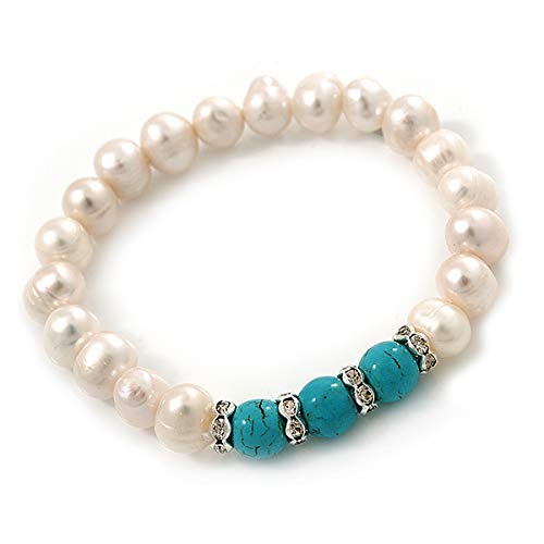 Avalaya - Avalaya 9mm Freshwater Pearl With Semi-Precious Turquoise Stone Stretch Bracelet - Size S