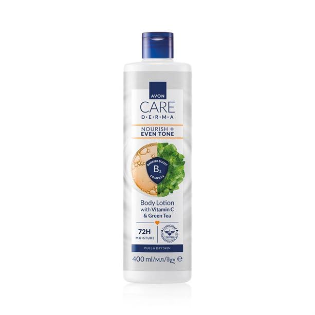 Avon - لوشن الجسم ديرما بفيتامين سي والشاي الأخضر يغذي البشرة ويوحد لونها بترطيب يدوم 72 ساعة من افون كير، 400 مل