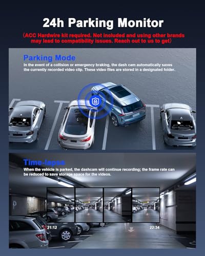 - 【24-Hour Parking Monitoring】Parking Mode: In the event of a collision or emergency braking, the dash cam automatically saves the currently recorded video clip. Time-Lapse: When the vehicle is parked, the dash cam continues to record at a reduced frame rate to save storage space for videos; (We have prepared the necessary ACC hardwiring kit for you; Not included, and using other brands may cause compatibility issues)