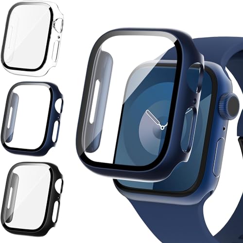 AWH - AWH Compatible for Watch Series 8/7 45mm Screen Protector - Built in 9H Tempered Glass Film - Overall Hard PC Protective Case for iWatch -3 Pack (Black+Blue+Transparent)