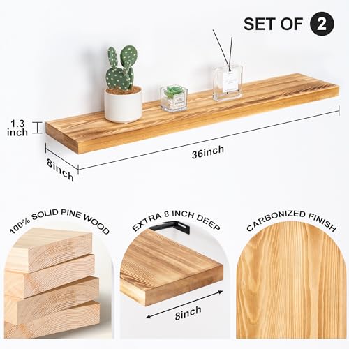 Axeman - Axeman Rustic Floating Shelves, 2 Pack 36 Inch Floating Wood Shelves for Wall, 8 Inch Deep Wooden Shelves for Living Room Bedroom Laundry Room Garage Farmhouse - Carbonized Black