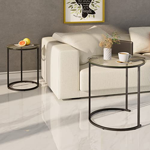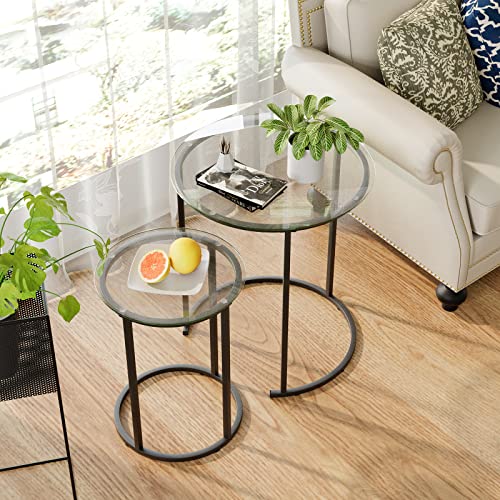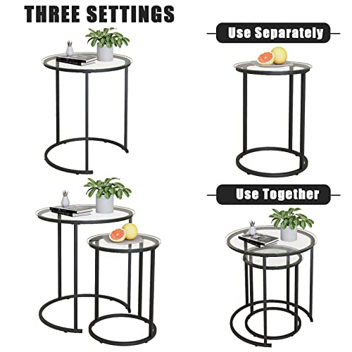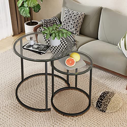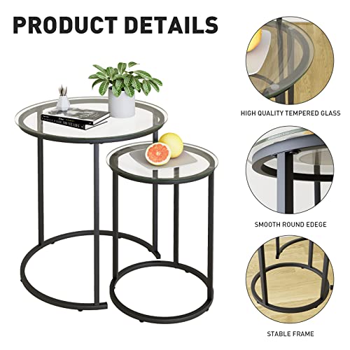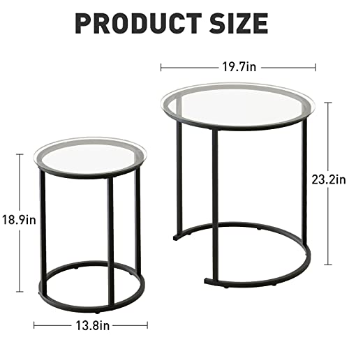 Azheruol - Nesting Coffee Table Set of 2,Modern Black Tempered Glass Side Table, Metal Frame Round End Table.Small Glass Tea Table for Living Room,Bedroom Studio Apartment Essentials, 23.2In