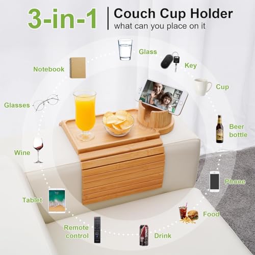 - 【Convenient Couch Cup Holder】Let your loved ones lounge worry-free with 3-in-1 design our couch arm table,which is designed as a comfortable arm rest table for couch! This is perfect if you have oversized furniture couch and are looking for a landing spot for a snack and drink, without needing to put up a side table, grab one of these for each couch end!