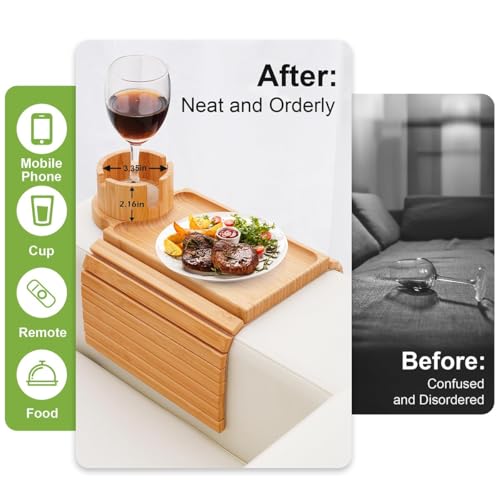 - 【Natural-Friendly & Stable】This sustainable couch arm table tray and arm rest cup holder for couch is made from 100% natural bamboo, ensuring sturdiness and durability.Easy to clean, it is natural, environmentally friendly, non-polluting, recyclable, and biodegradable into natural fertilizer. The bottom non-slip design keeps the tray firmly on the couch, ensuring stability during use and preventing unnecessary slipping.