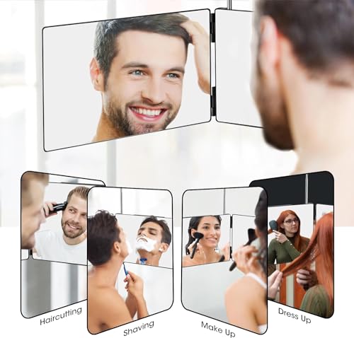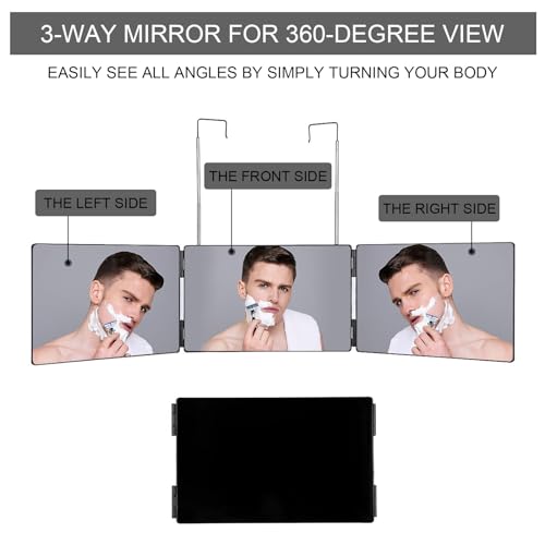 - ✂️【رؤية بانورامية 360 درجة】: يمكن فتح المراية ثلاثية الاتجاهات لتوفير رؤية كاملة بزاوية 360 درجة، مما يسمح لك بمراقبة زوايا مختلفة لرأسك ووجهك بسهولة. مثالية لقص الشعر في المنزل والحلاقة وصبغ الشعر وتصفيف الشعر والمكياج، مما يضمن عدم تفويت أي مناطق.