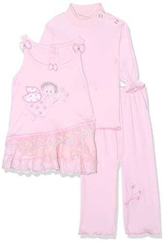 Baby Cadeau - Girl's Stitched Ribbon Lace Detail Dress with T-shirt & Elastic Waist Pants (Pink, Set of 3 Pieces, 0 - 3 Months)