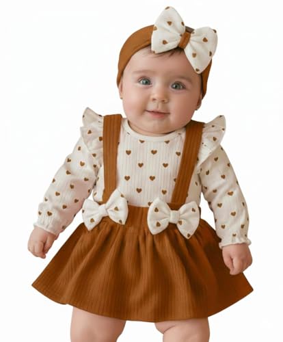 Generic - Baby Girls' Classic Dress Set, Cream and Brown, 3 Pieces, Hearts, Long Sleeves, 12-18 Months