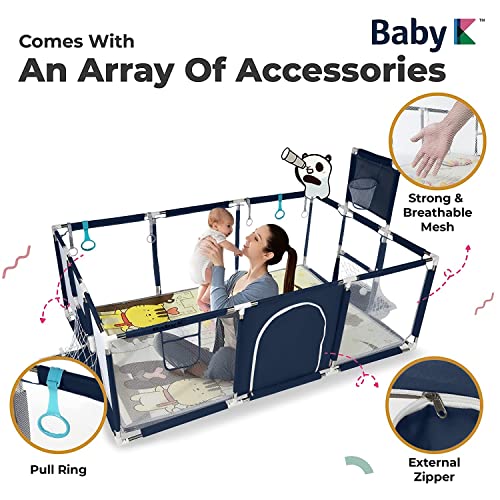 - 👶 مساحة مثالية للعب - بفضل السجادة المانعة للانزلاق ولوحة الشبكة الشفافة، يمكنك الاطمئنان إلى أن ساحة اللعب هذه للأطفال البيبي والصغار مثالية للعب المستقل.