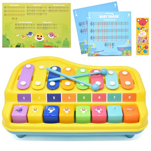 Baby Shark 2 in 1 Baby Piano Xylophone Toy for Kids Toddlers Girls Boys First Musical Instrument with Multicolored Keys Keyboard Sheet Music Two Mallets