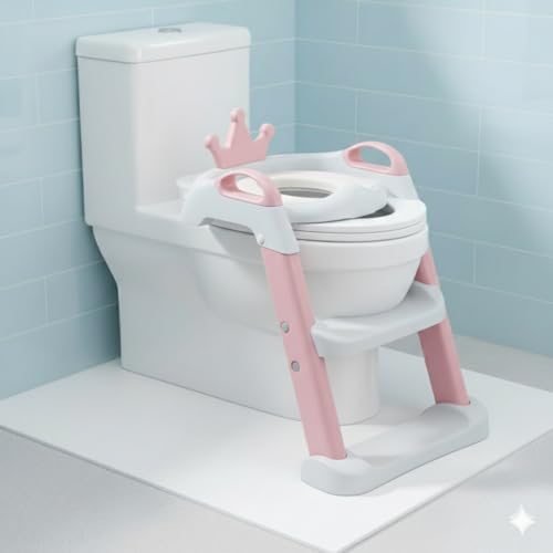 Generic - Baby Toilet Seat with Ladder, White and Pink, with Handles and Steps, Crown Design, Toddler Training