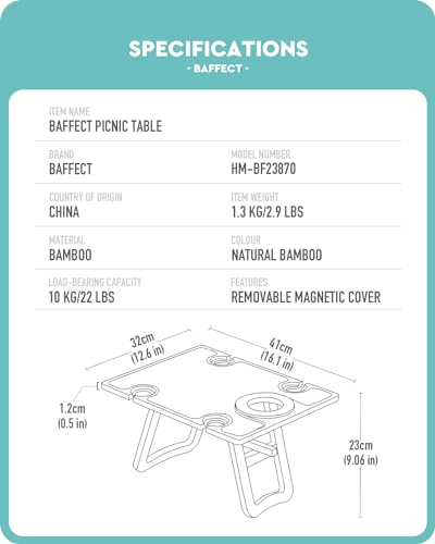 - High-quality material - This beach picnic table is made of natural bamboo, ensuring durability and sturdiness. It is reinforced with 4 strong nails at every juncture between the table legs and the board, capable of holding up to 10kg/22lbs. The entire tray surface is coated, waterproof and offering double protection. Plus, this picnic table requires no assembly, making it a hassle-free choice.