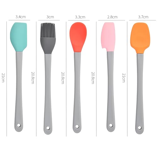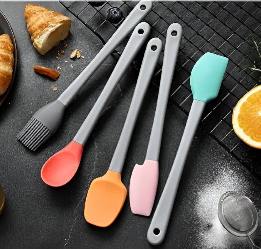 - This 5-piece silicone spatula set is perfect for a variety of cooking and baking tasks. The set includes spatulas of different sizes and shapes to suit any kitchen need, from mixing to scraping and stirring.