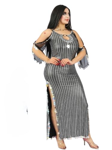 Generic - جلابية بلدي شرقية للنساء – مزينة بالترتر – مقلمة بالأسود والفضي – مناسبة للرقص الشرقي والحفلات – مقاس موحد