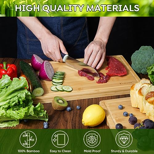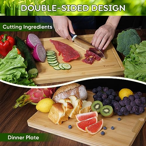 - [VERSATILE AND PRACTICAL] The bamboo large cutting board offers ample space for chopping, slicing, and dicing. Whether you're preparing vegetables, meats, or bread, this chopping board is designed to meet all your culinary needs. It's also reversible, providing a smooth surface on one side and a juice groove on the other to capture any drippings and prevent a messy countertop.