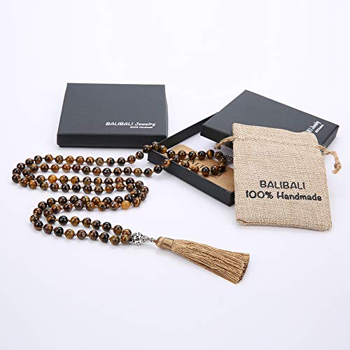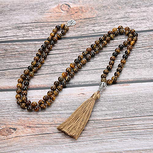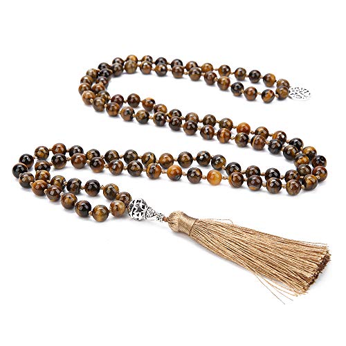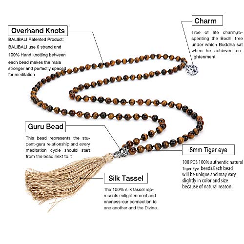 BALIBALI - سلسلة خرز مالا من 108 حجر شبه كريم معقودة يدويا بشراشيب مع دلاية بشكل شجرة الحياة بالي للنساء بنات للرجال