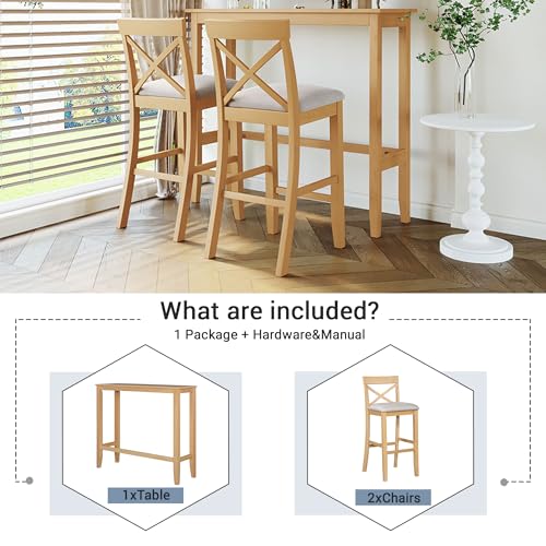Ball & Cast - بول اند كاست مجموعة كراسي طاولة بارتفاع ريفي من 3 قطع، 47.5 انش، زاوية مطبخ لتناول الافطار مع 2 كرسي بار منجد، طاولة بار خشبية للمنزل وغرفة الطعام والاماكن الصغيرة، طبيعي