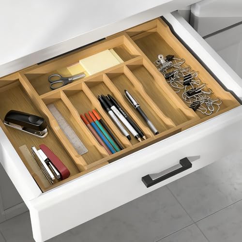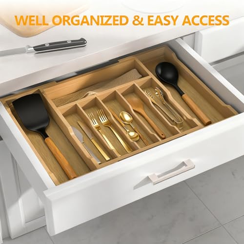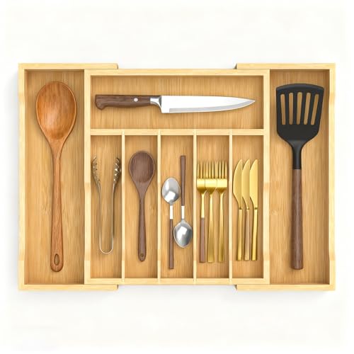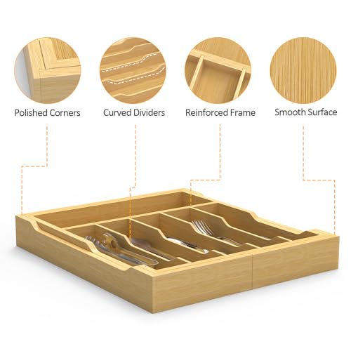 Bambition - Bamboo Kitchen Drawer Organizer, 13" to 23" Expandable Utensils Holder, 6-8 Slots Silverware Organizer Cutlery Tray