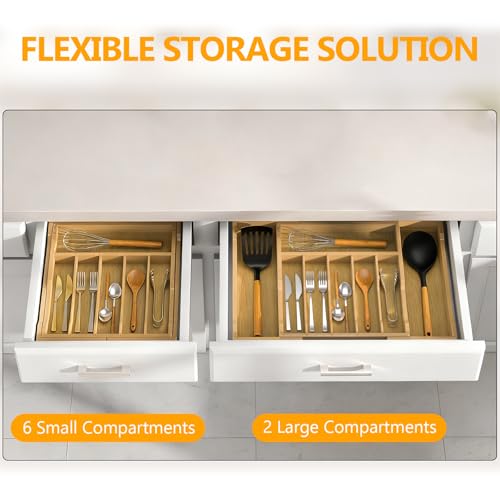 - FLEXIBLE STORAGE - It can expand from 6 to 8 slots. 3 large slots can hold large kitchen utensils like ladles, tongs and whisks. 5 small slots can hold forks, spoons and other small silverware. It keeps everything in the right place and separated without scratching with each other.