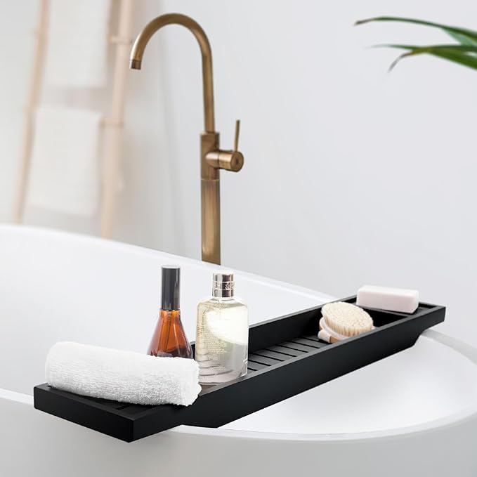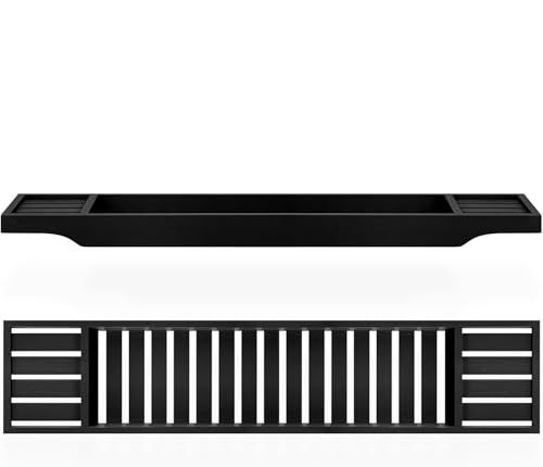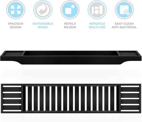 LIZZIE JACOBS - رف حوض الاستحمام من الخيزران، حامل حمام خشبي، صينية مرتبة، منظم تخزين لملحقات الحمام، رف حمام فوق حوض الاستحمام، رف تخزين، منظم للاسترخاء (أسود)