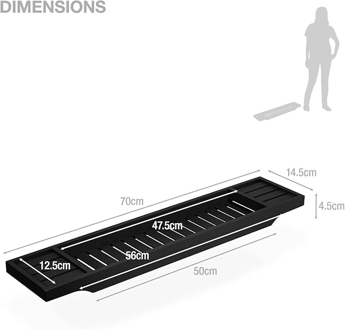 - الأبعاد: بطول 70 سم يناسب جميع أحواض الاستحمام ذات الحجم القياسي - ببساطة ضعه فوق حوض الاستحمام واستمتع بوظيفة الصينية العملية. مقاس صينية الحمام هو: 70 × 14.5 × 4.5 سم.