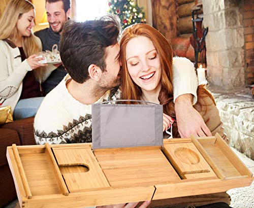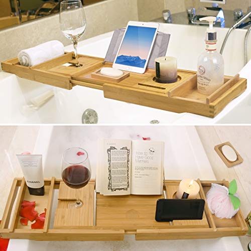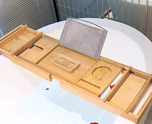 Youpehom - صينية حوض استحمام من الخيزران قابلة للتوسيع للحمام الفاخر، ملحقات الحمام والطاولة مع حامل اكواب النبيذ، منظم حمام حامل كتب مع جوانب ممتدة للرجال والنساء، طبيعي