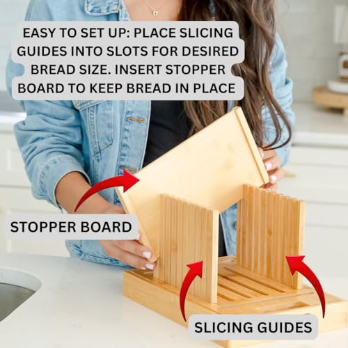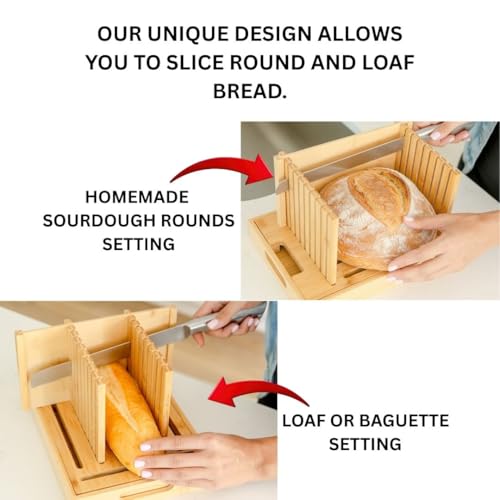 - تصميم فريد قابل للتعديل يسمح بتقطيع الخبز من أي حجم - أدخل جدران التوجيه في الفتحات على طول قطاعة الخبز القابلة للتعديل لخبز الساندويتش أو الرغيف الفرنسي، أو في الفتحات - لتقطيع الكرات المستديرة الجميلة مثل العجين المخمر المصنوع منزليًا والخبز الحرفي. كل ما عليك القيام به هو تدوير قطاعة الخبز الخشبية المصنوعة من الخيزران وضبط الإعداد عن طريق إدخال الأدلة في الفتحات المخصصة. يرجى الاطلاع على التعليمات في الصور. قطاعة الخبز القابلة للتعديل هذه مناسبة لجميع أشكال الخبز. إنه عجين مخمر لا غنى عنه!