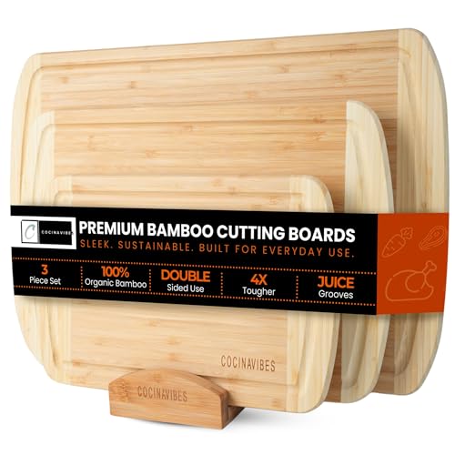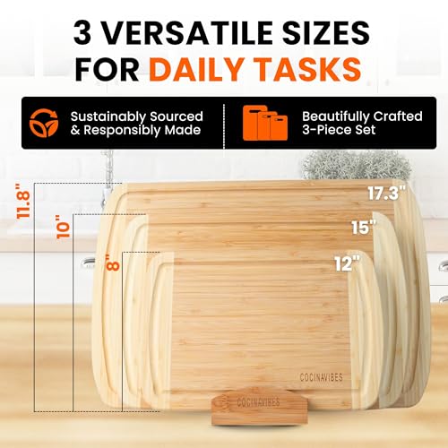 CocinaVibes - Bamboo Cutting Board Set – Charcuterie & Chopping Boards for Kitchen, Large & Small Sizes, Safe Cutting Boards for Meat, Cheese, Pizza – Home & Kitchen Gift Idea