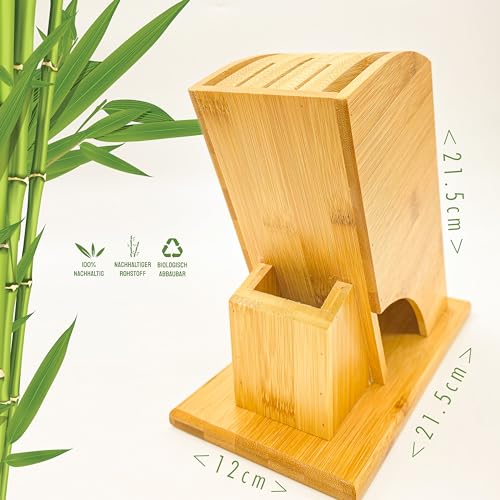 - Details – Our knife block is made from sustainable bamboo. The dimensions of the knife block unequipped are 12 cm x 21.5 cm x 21.5 cm and therefore offer plenty of space for up to 6 knives.