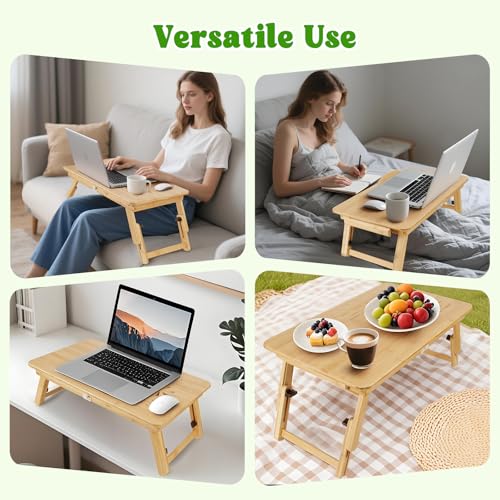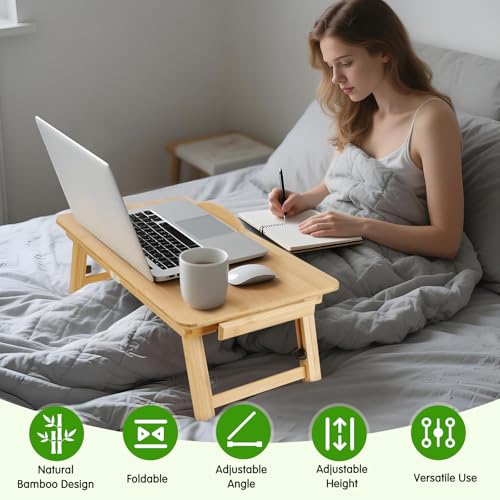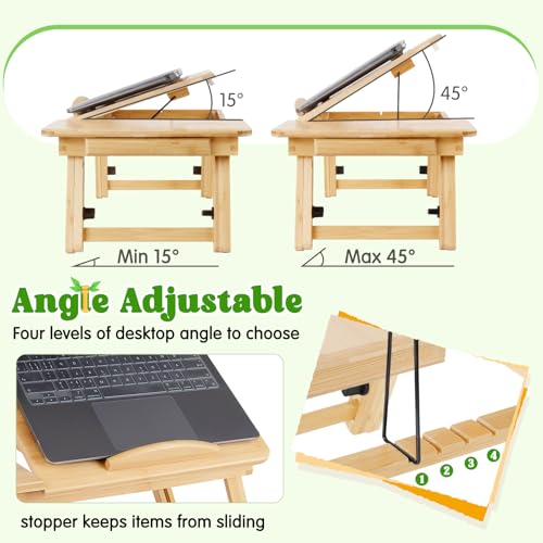 Dezyfurni - Bamboo Laptop Desk, Adjustable Foldable Bed Tray Table for Bed, Sofa, and Floor, Portable Lap Desk with Tilting Top & Drawer for Writing, Reading, Breakfast, Drawing, and Working