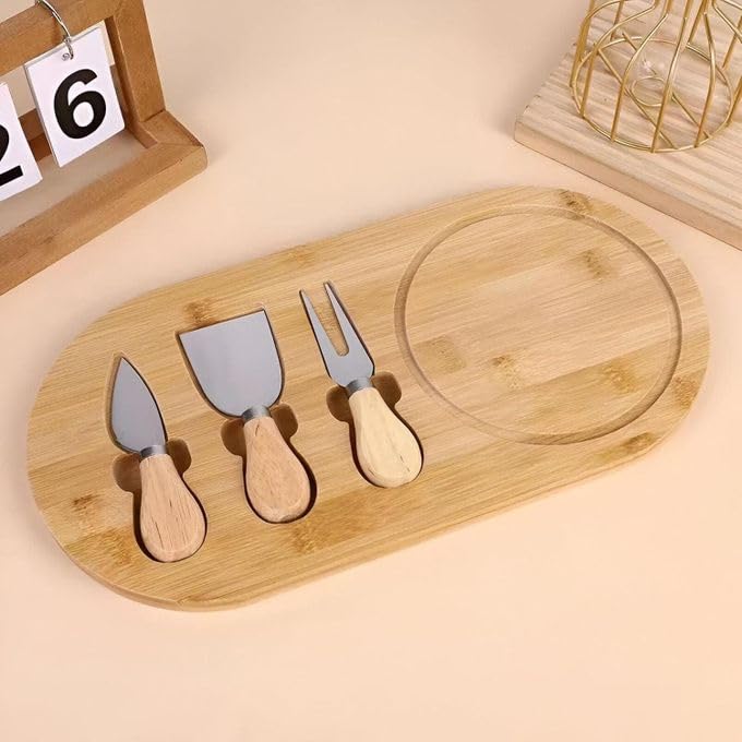 Generic - Bamboo Oval Cheese Cutting And Serving Board Set With Three Handy Knives 35 cm Easy Table Setup For Home Use Casual Hosting And Simple Kitchen Serving