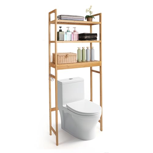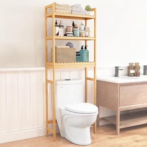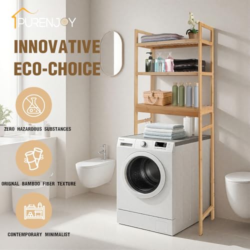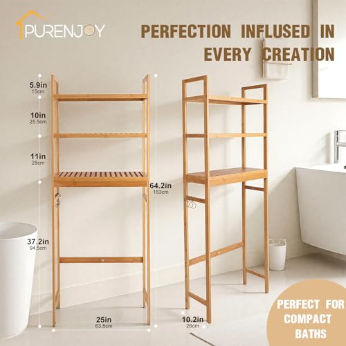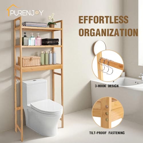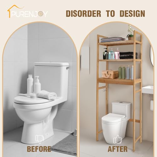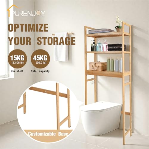 PURENJOY - Bamboo Over-The-Toilet Storage Rack – 3-Tier Freestanding Bathroom Shelf, Adjustable Bamboo Organizer, Space-Saving Toilet Storage Unit (Original)