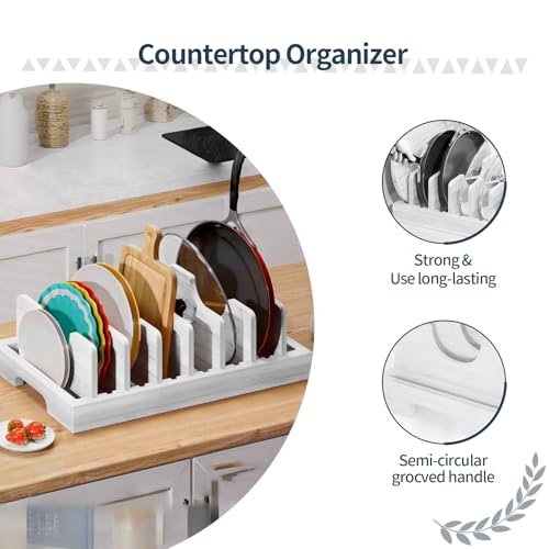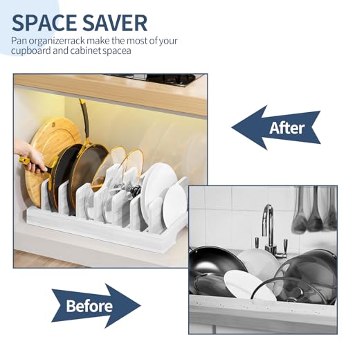 - 【Adjustable pan organizer】: Lid organizers inside cabinet featuring 7 removable dividers, you can arrange the slots to accommodate lids and pans of various sizes; Each pan rack divider has a notch at the top to hold the lid handles securely in place
