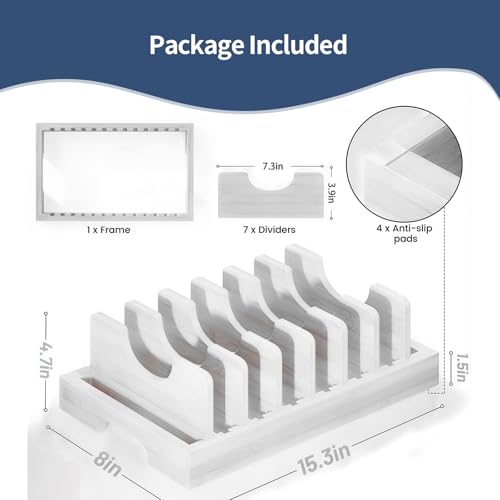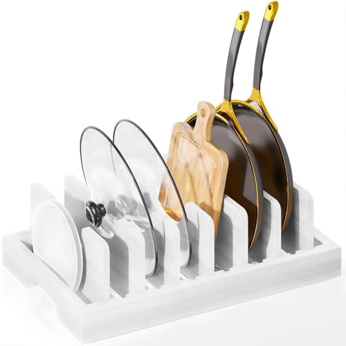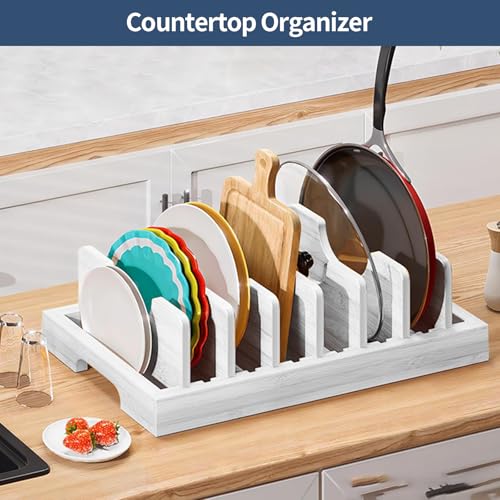 - 【Versatile Bamboo Pot Lid Organizer】: Revamp your kitchen storage with our 15.3 x 8 x 4.7-inch bamboo pot lid holder; Pan organizers inside cabinet has 7 adjustable dividers and 13 customizable slots, it’s designed to adapt to your unique needs.
