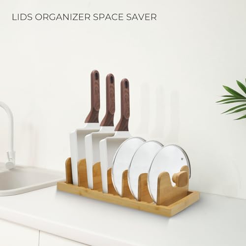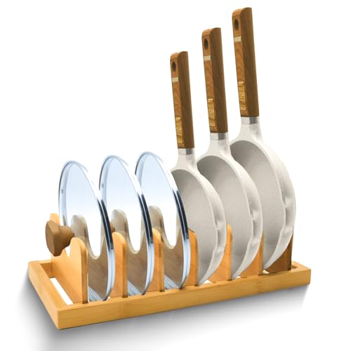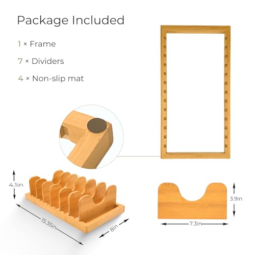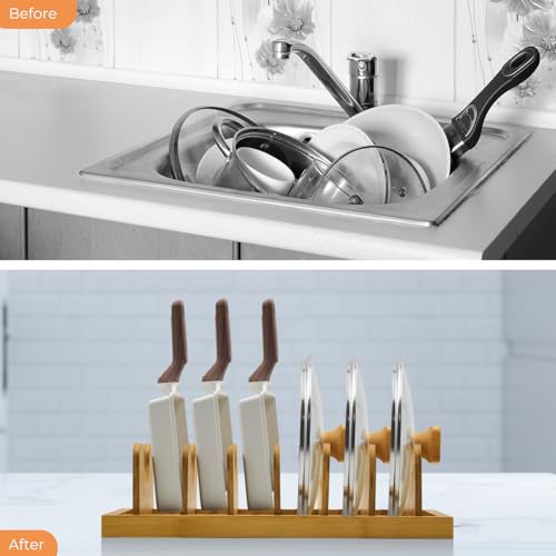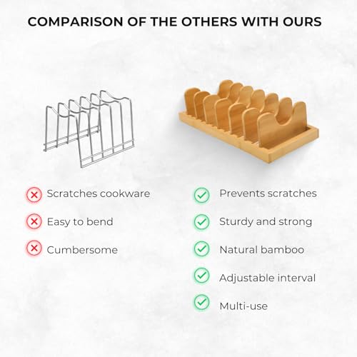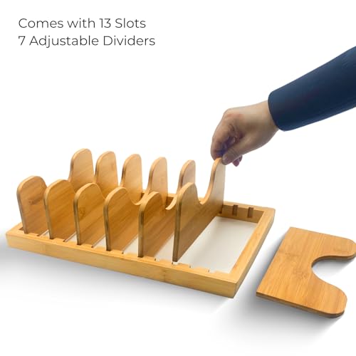 - 【تخزين ثابت وآمن】قل وداعًا لعدم ثبات الغطاء مع منظمات الأغطية الخاصة بنا داخل الخزانة. تتميز الفواصل الجديدة بأخدود على شكل حرف U أعمق، مما يثبت المقبض والأغطية المثبتة بإحكام في مكانها. سواء تم استخدامه في الأدراج أو الخزانات أو على أسطح المناضد، فإن منظم الأغطية المصنوع من الخيزران هذا يزيل متاعب تكديس الغطاء أو حفره.