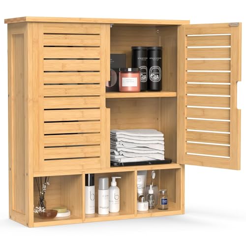 BAMBOOHOMIE - Bathroom Wall Cabinet, Bamboo Medicine Cabinet with 2 Door & Adjustable Shelves, Over The Toilet Space Saver Cabinet with 3 Open Shelves Wall Mounted Storage Organizer for Bathroom Kitchen