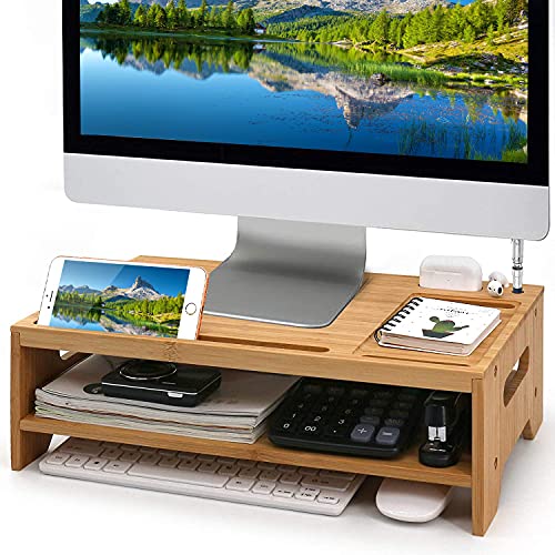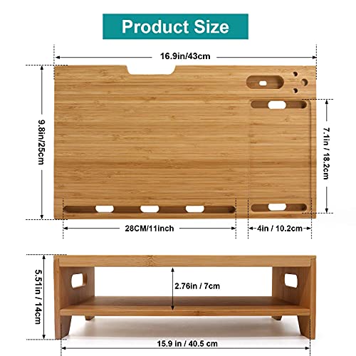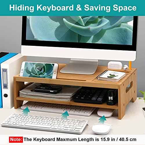 - 【Spacious Multifunctional Organizer】---BambuMate monitor stand riser comes with hidden charging slots and more media slots to hold your devices like tablets, cell phones , compatible with AirPods. Also great for holding stapler, clips, calculator and other office supplies. The monitor shelf provides 15.9 In / 40.5 cm long area and double tiers design for storing laptops, keyboards, mice or daily necessities to keep your desktop orderly.