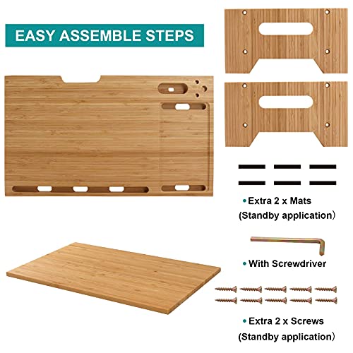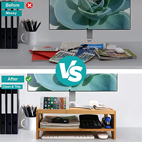 - 【Durable 2-Tiers Bamboo】---This durable bamboo material of computer monitor riser stand is harder and stable, environment friendly. Not only it looks beautiful and generous, but also it has more advantages than those MDF BOARD MADE PRODUCTS which is very easy to have a chip. Also with an extra proper 5.5 inches height to relieve the burdens on your neck and shoulder.