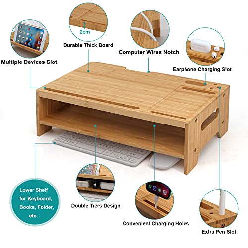 BambuMate - Bamboo Monitor Stand Riser, with Charging Holes, Media Slots Compatible with AirPods, Kindle, Tablets, Cell Phones, 2 Tiers Desktop Organizer, Versatile as Printer Laptop Holder