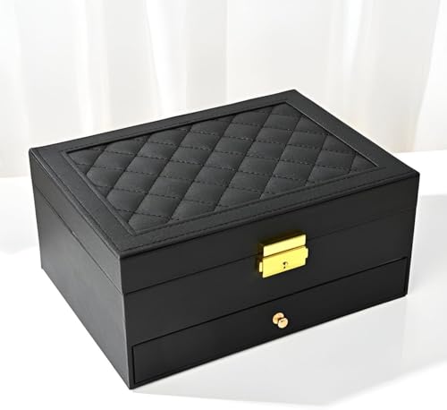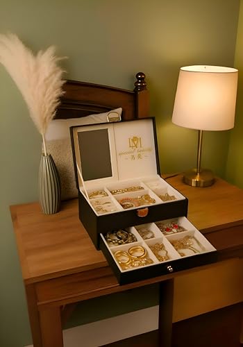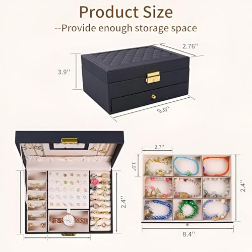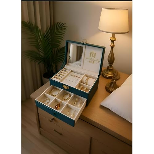• يتميز صندوق المجوهرات بمساحة داخلية واسعة مع مساحات تخزين متعددة مصممة لتنظيم الخواتم والقلائد والأساور وغيرها من الملحقات الصغيرة، مما يضمن الوصول السريع ومنع التشابك.