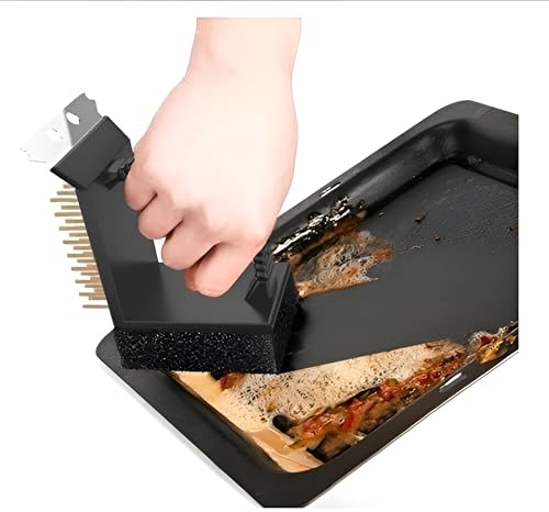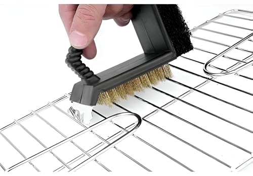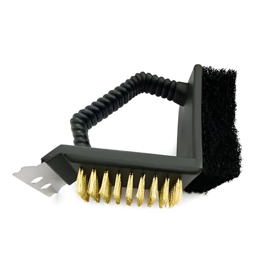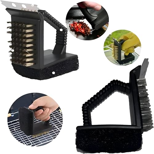 - This 3-in-1 grilling brush features a heat-resistant plastic construction combined with a copper wire brush, coarse sponge, and a sturdy plastic scraper, making it a versatile cleaning tool suitable for all types of outdoor grills while preventing surface scratches.