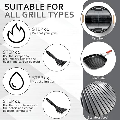 - يصبح تنظيف الشواية مهمة سريعة وفعالة بفضل المواد المتينة والحجم المثالي ومجموعة الفرش المتعددة. يوفر هيكلها الوقت والطاقة الثمين عن طريق إزالة البقايا والشحوم والطبقات المحترقة بسهولة، مما يساعدك على التركيز أكثر على الاستمتاع بالشواء بدلاً من الفرك إلى ما لا نهاية.