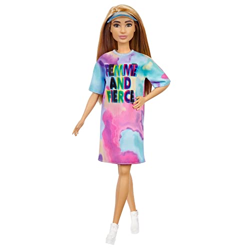 - Barbie Fashionistas Doll, Petite, with Light Brown Hair Wearing Tie-Dye T-Shirt Dress, White Shoes & Visor, Toy for Kids 3 to 8 Years Old