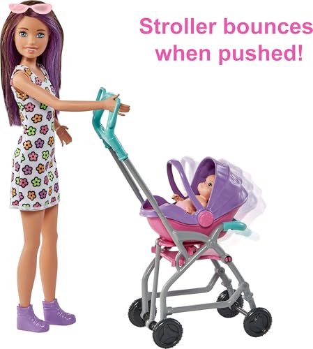Barbie - دمية العناية بالاطفال سكيبر بيبي سيتر من باربي مجموعة لعب مع مربية الاطفال سكيبر (سمراء) وعربة اطفال وطفل لعبة و5 اكسسوارات، لعبة للاطفال بعمر 3 سنوات وما فوق